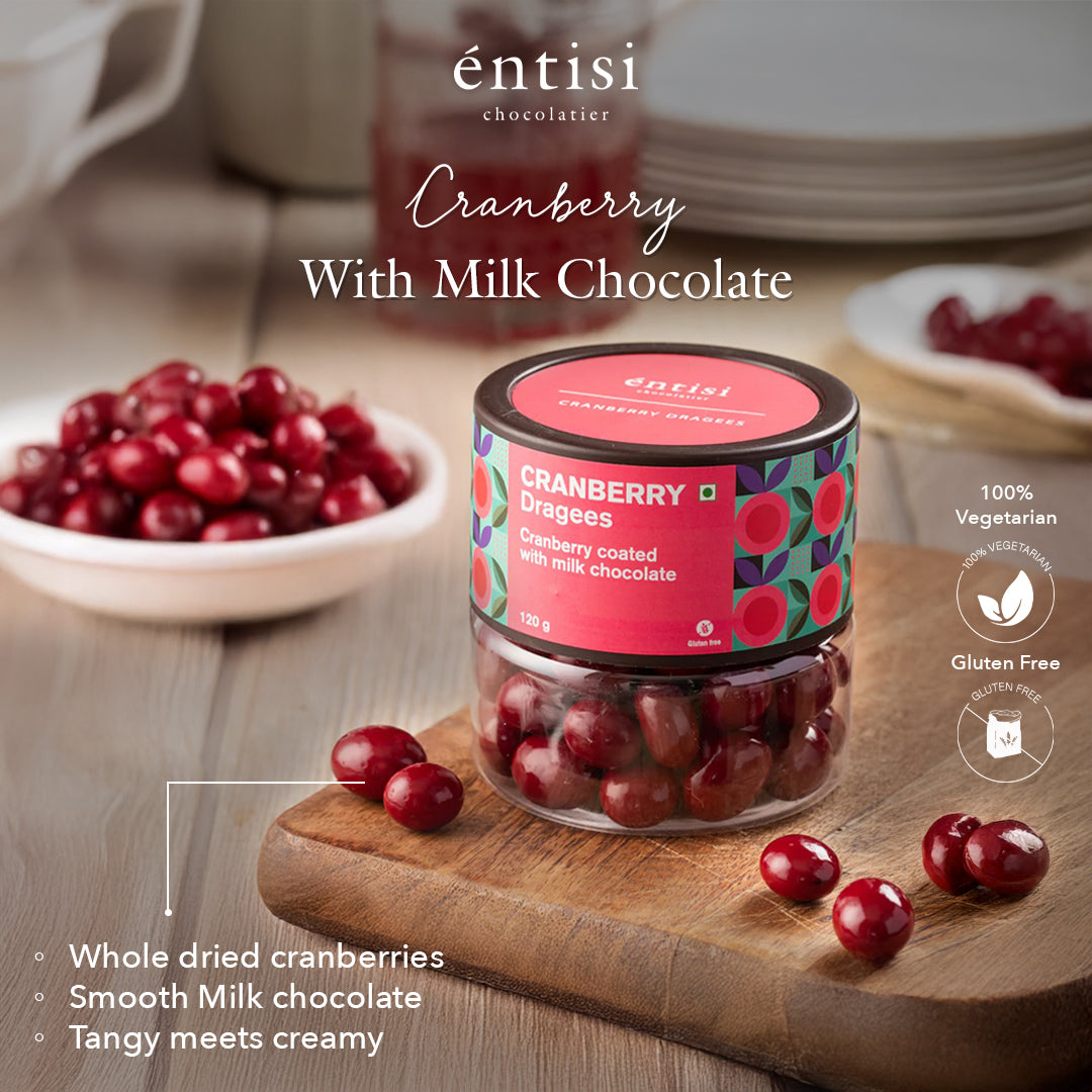 éntisi dragees are chocolate coated nuts or fruits made with the finest quality of ingredients sourced from around the world. Whole tangy cranberries dipped in milk chocolate.