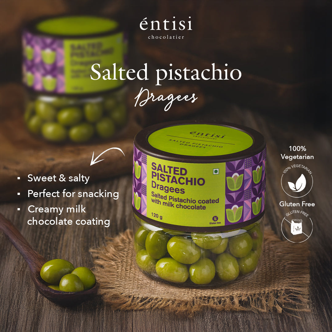 éntisi dragees are chocolate coated nuts or fruits made with the finest quality of ingredients sourced from around the world. Whole salted pistachios dipped in milk chocolate.