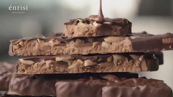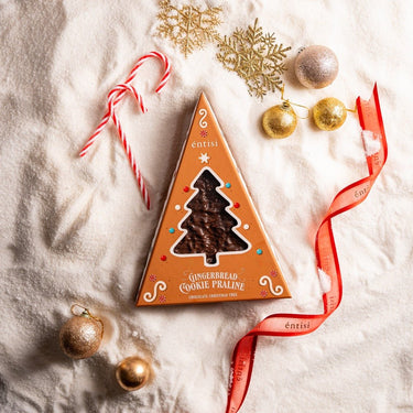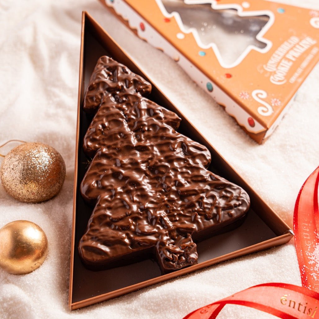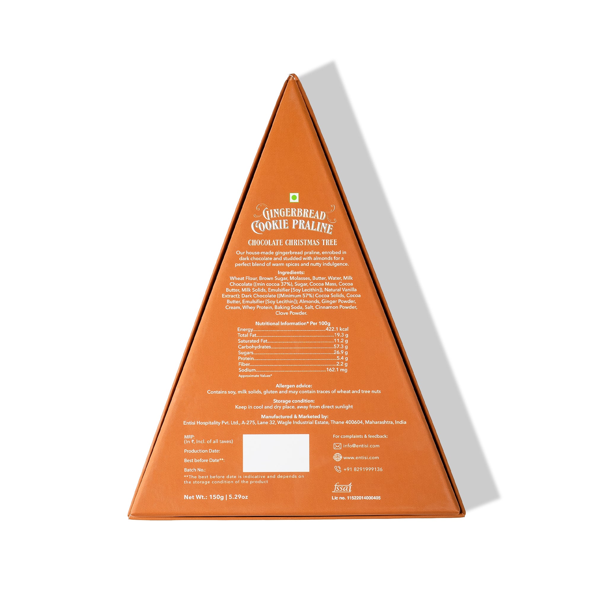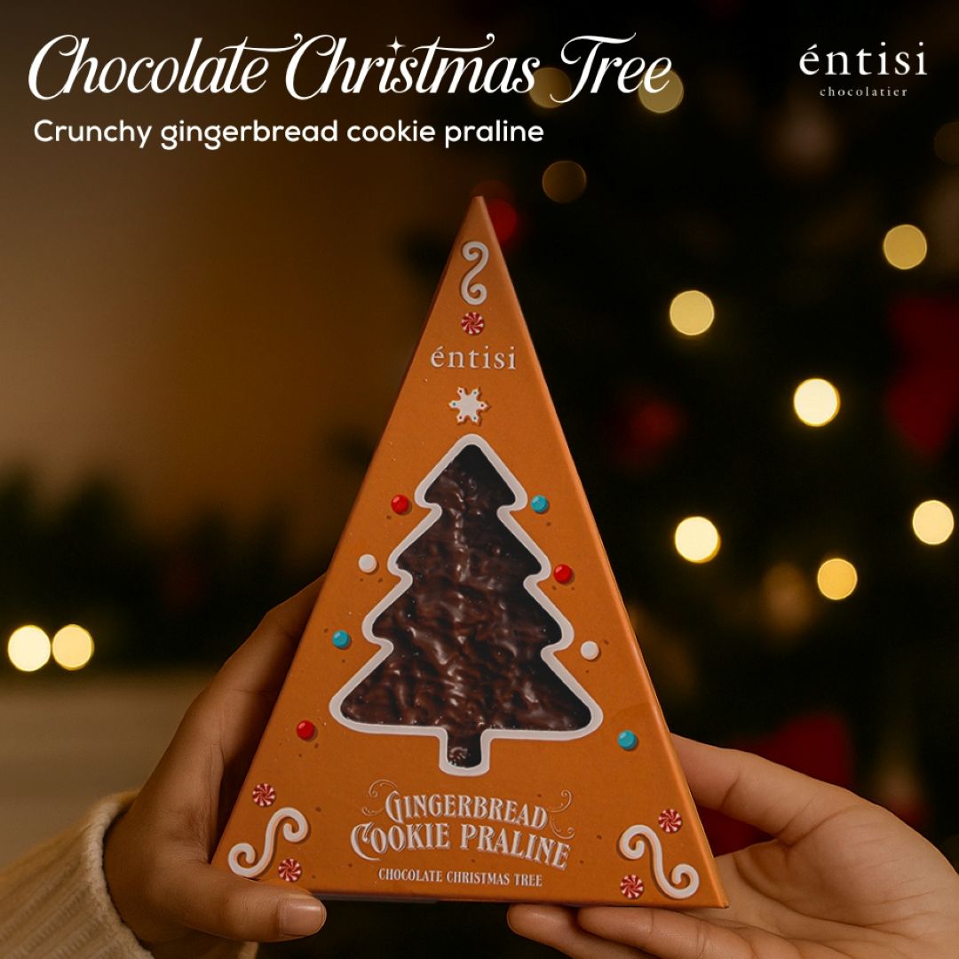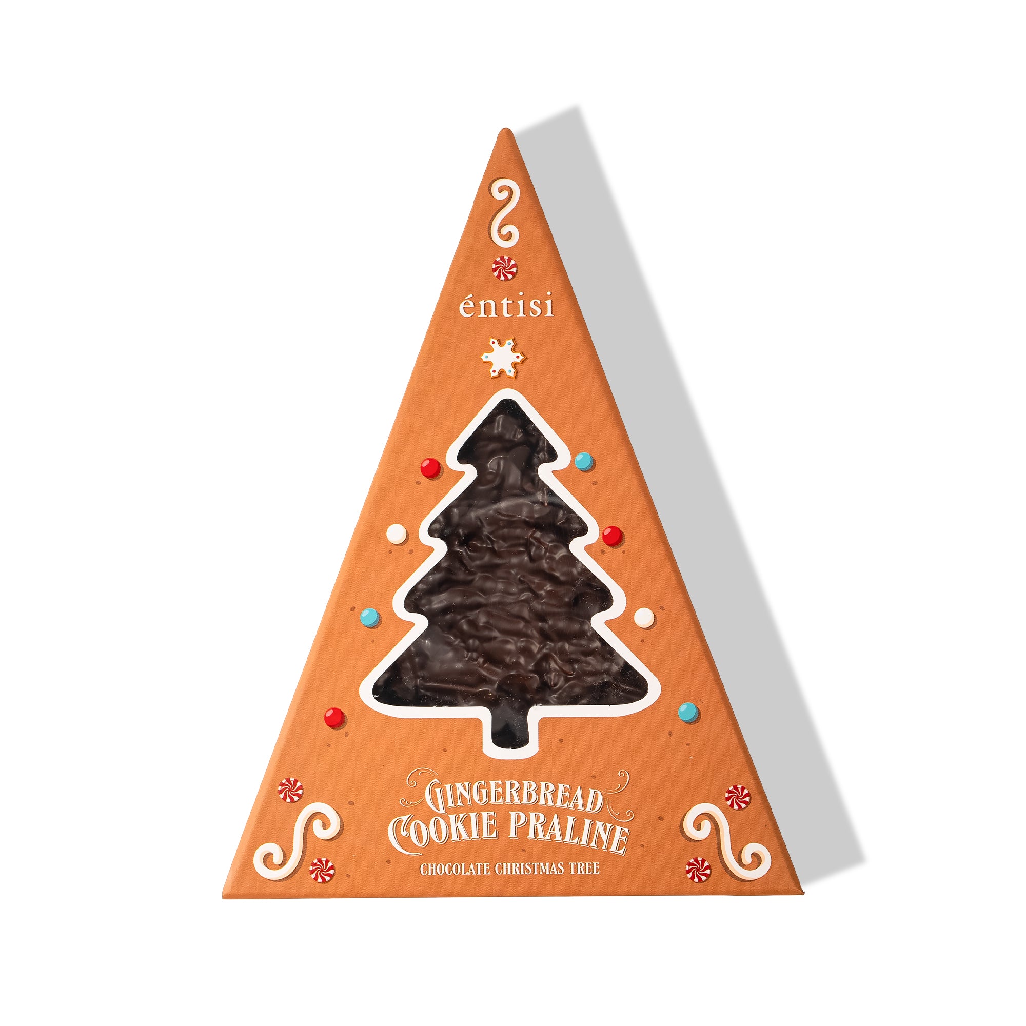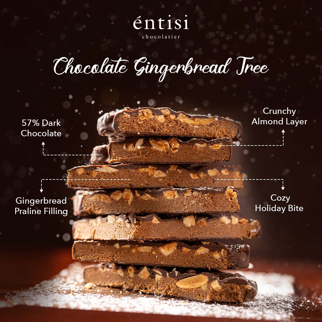 A Chocolate Christmas tree - A delicate gingerbread cookie praline, enrobed in smooth dark chocolate and complemented by roasted almonds. It is perfect blend of warm spices and nutty indulgence.