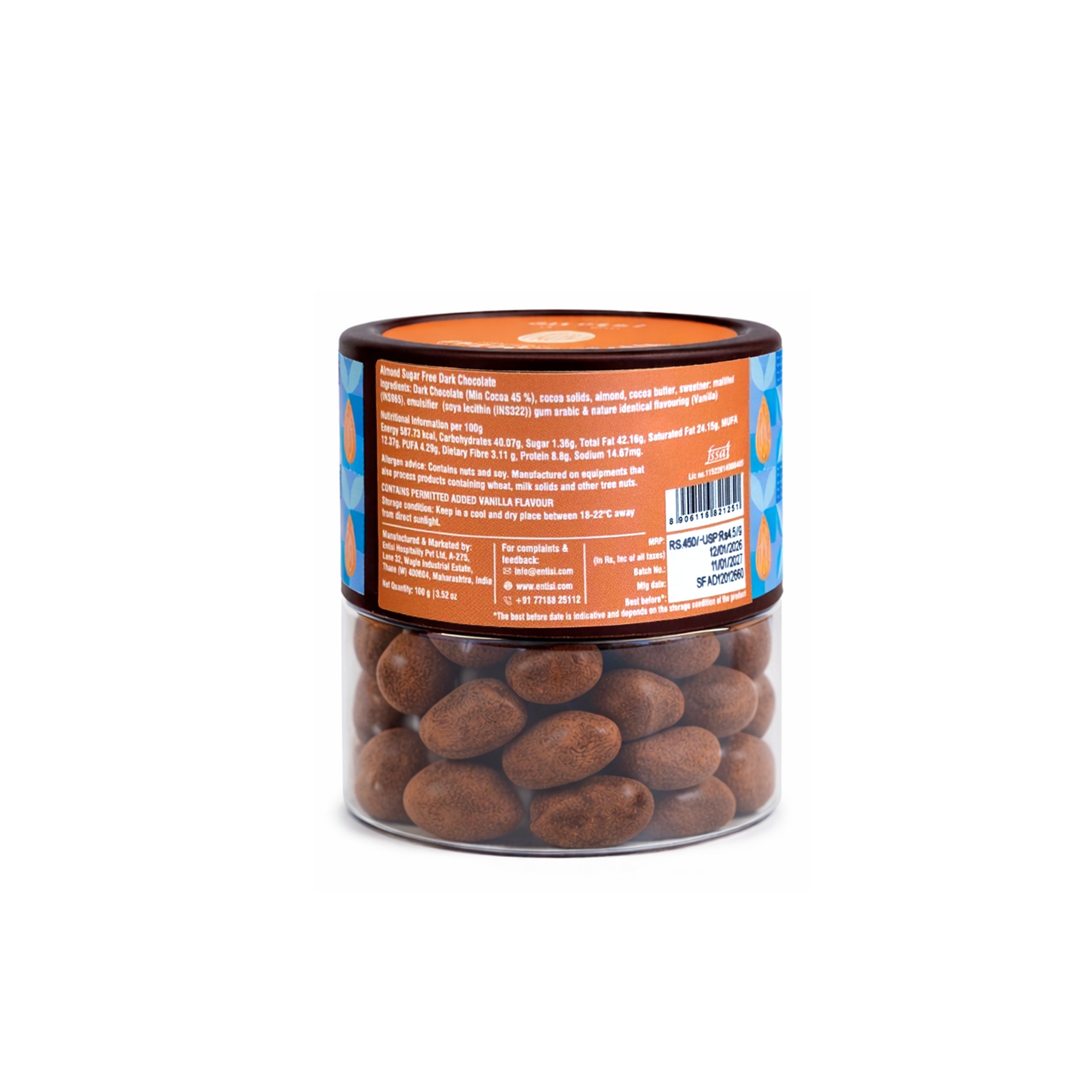 Entisi dragees are chocolate-coated nuts or fruits made with the finest quality ingredients sourced from around the world. Whole almonds coated in sugar-free dark chocolate and dusted with cocoa powder.